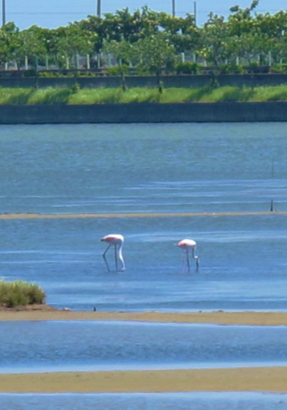 View in my scooter’s mirror of the wetlands at Km 134.5 on Highway 17, which today were absolutely teeming with egrets, terns and passage waders.