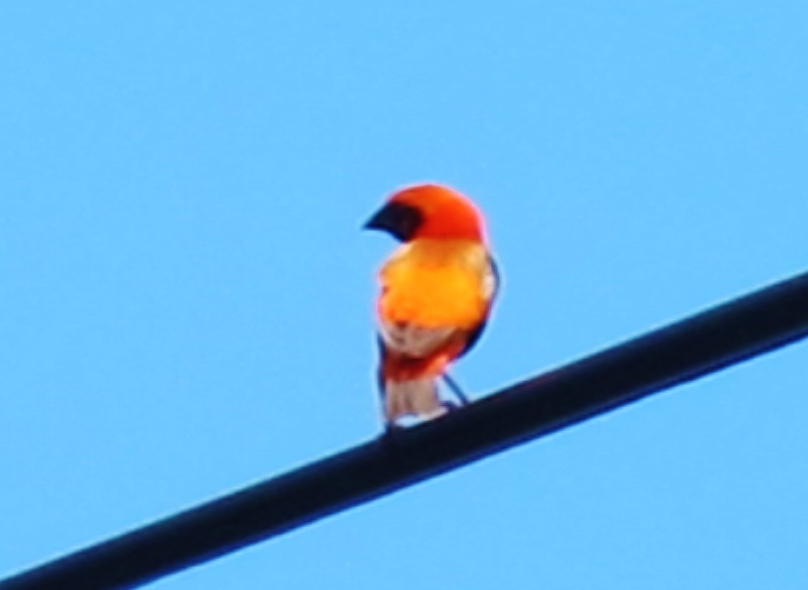 While watching some waders, I was distracted by an unfamiliar song coming from the banks of the canal behind me. The protagonist was a small and very colorful bird, which seemed to be aggressively holding territory, chasing off any Japanese White-eyes and Scaly-breasted Munias that dared come too close! It looked to perhaps be a Southern Red Bishop, but in other photos I’ve seen of this species they normally seem to have a red collar (not an all-black face and breast). It’s obviously an escaped cagebird, but I would welcome any comments as to its identification.
